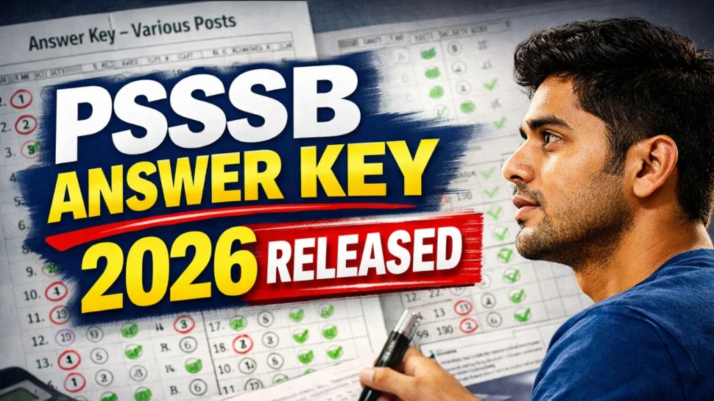 PSSSB Answer Key 2026 has been released for Coupan Clerk, Carpenter, Plumber, Work Mistry, Accountant and other posts. Download answer key and OMR sheeThe (PSSSB) has officially released the PSSSB Answer Key 2026 along with the OMR sheet for the written examination held on 17 January 2026.Candidates who appeared in the exam can now view … Continue reading PSSSB Answer Key 2026 Released for Various Posts